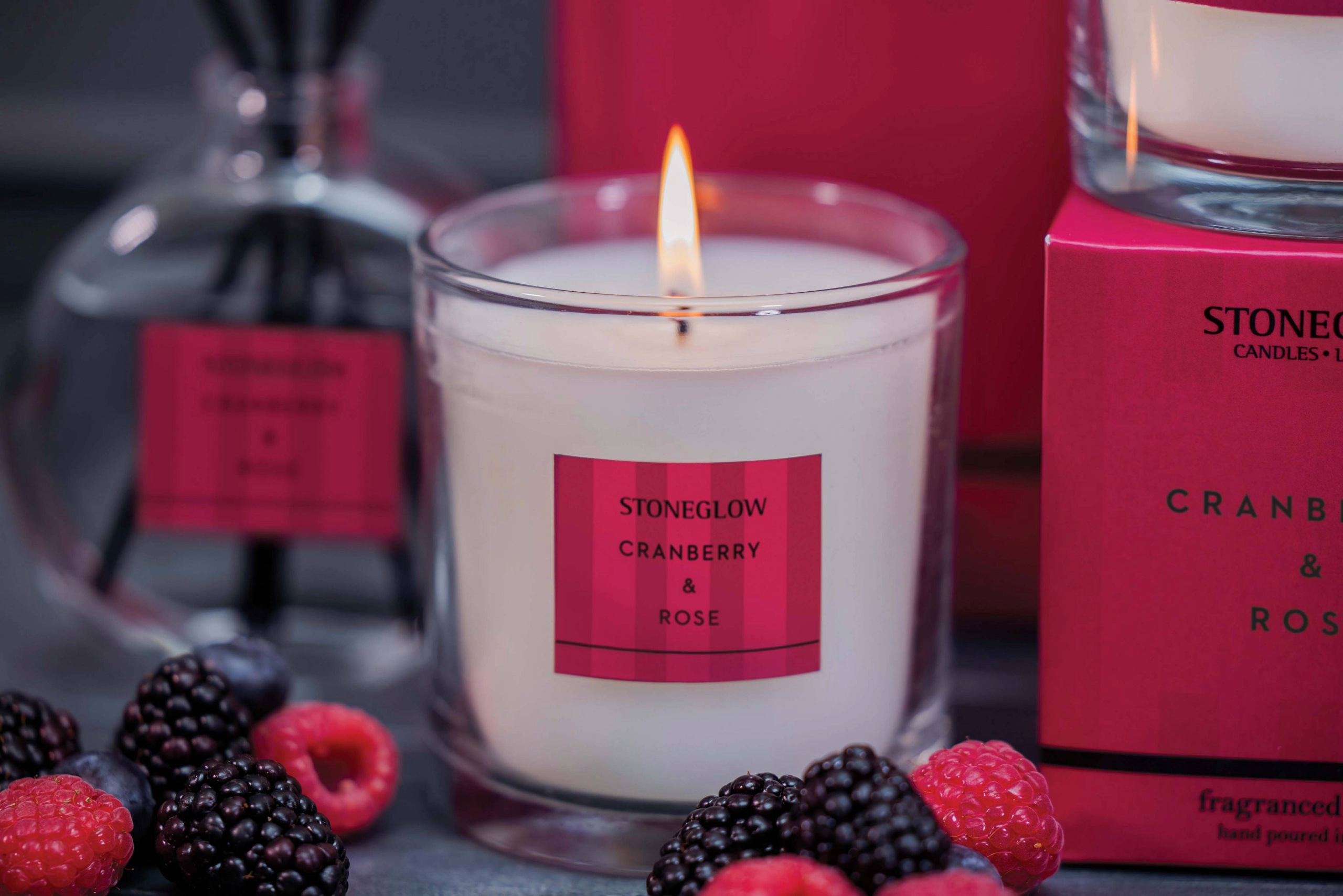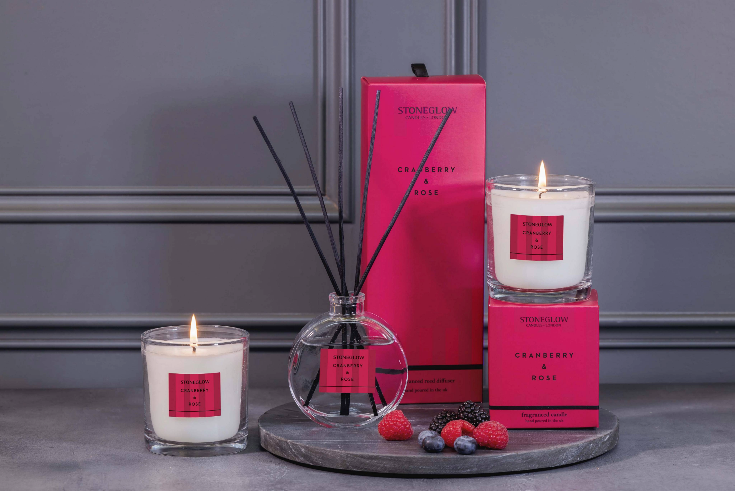 CRANBERRY & ROSE – Tart cranberries and zesty fresh marmalade mingle with a whisper of cinnamon bark, while fruity wild berries and delicate rose petals add warmth and depth. This festive fragrance captures the glow and comfort of the season — a sophisticated balance of bright citrus, fruity sweetness, and gentle spice, filling your home with a cheerful, luxurious aroma perfect for seasonal celebrations.