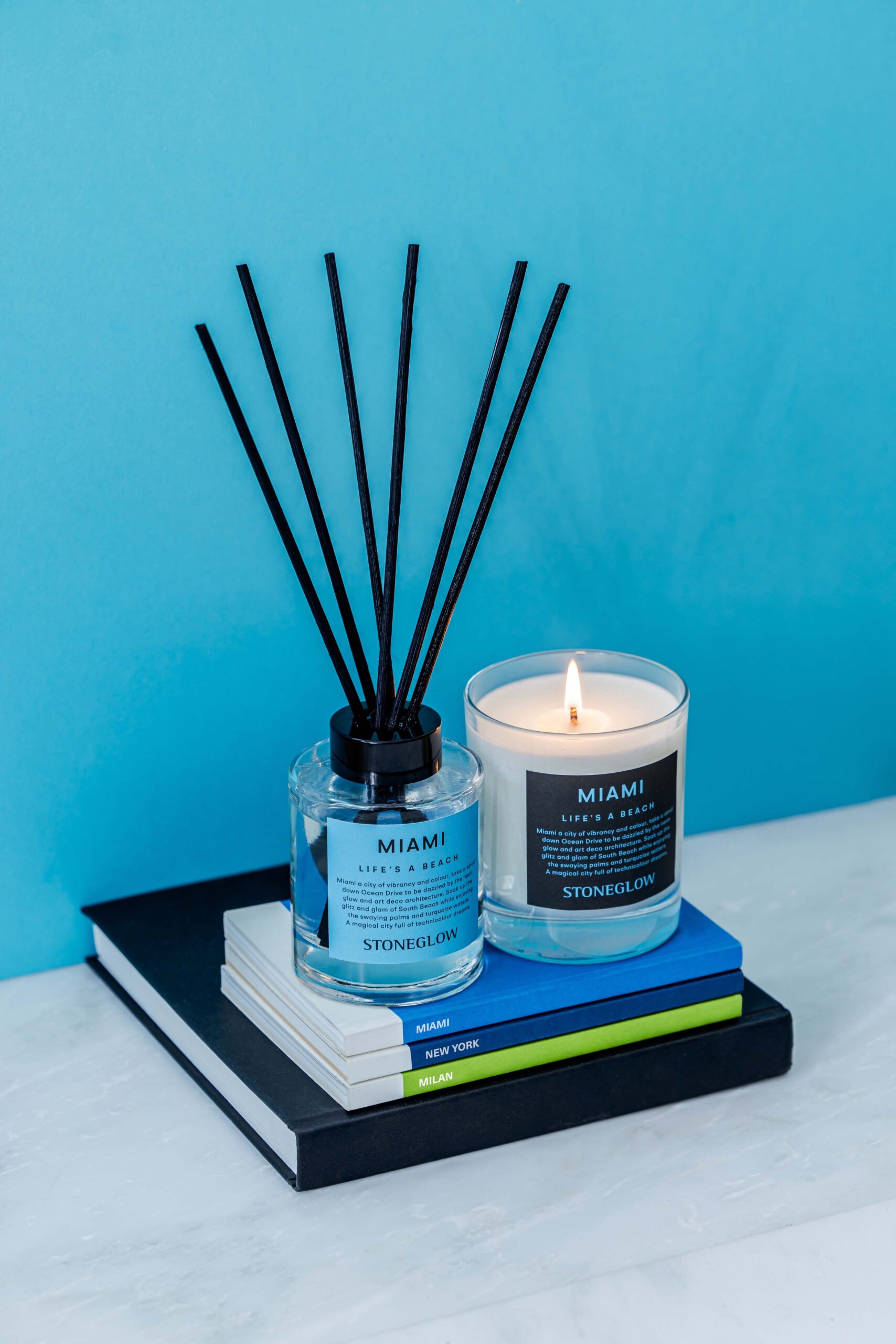 Coastal calm meets city sophistication with the Stoneglow Explorer – Miami – Life’s a Beach scented Candle. Miami, a city of vibrancy and colour, take a stroll down Ocean Drive to be dazzled by the neon glow and art deco architecture. Soak up the glitz and glam of South Beach while enjoying the swaying palms and turquoise waters. A magical city full of technicolour dreams. This hand poured 220g soy wax candle blends the crisp brightness of lemon with the soft floral depth of jasmine, grounded by aromatic clary sage, capturing the essence of late afternoons on South Beach and sultry nights beneath neon lights.
