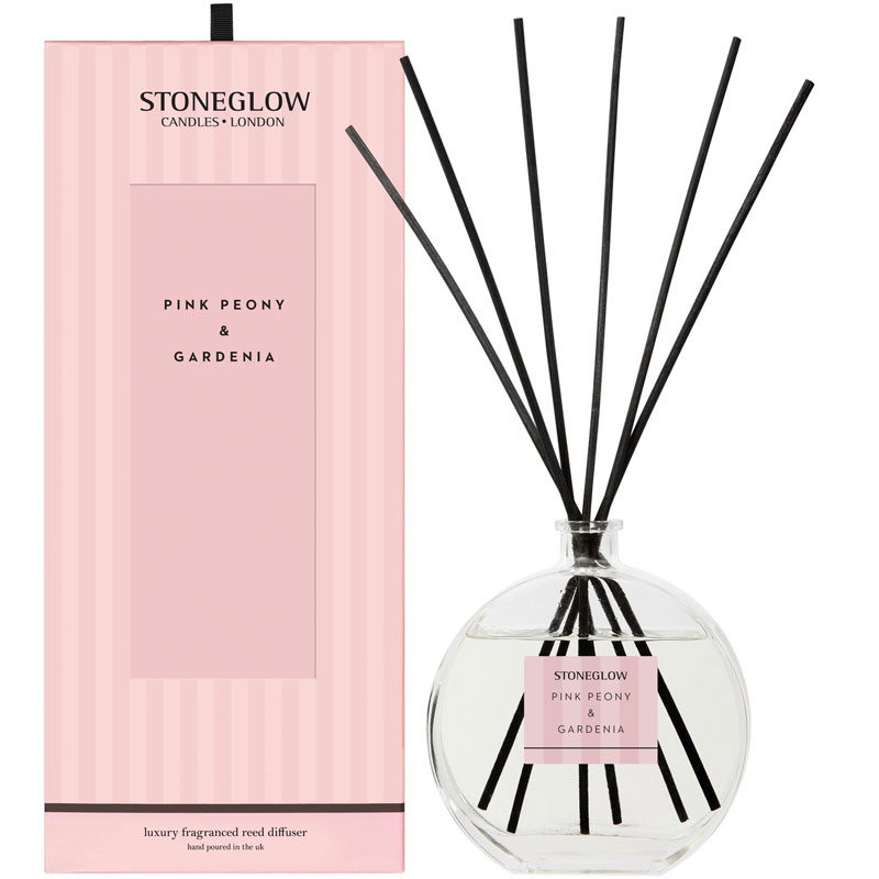 Modern Classics Pink Peony & Gardenia Reed Diffuser: 460ml of vibrant floral and rich woody notes, offering up to 32 weeks of elegant fragrance.