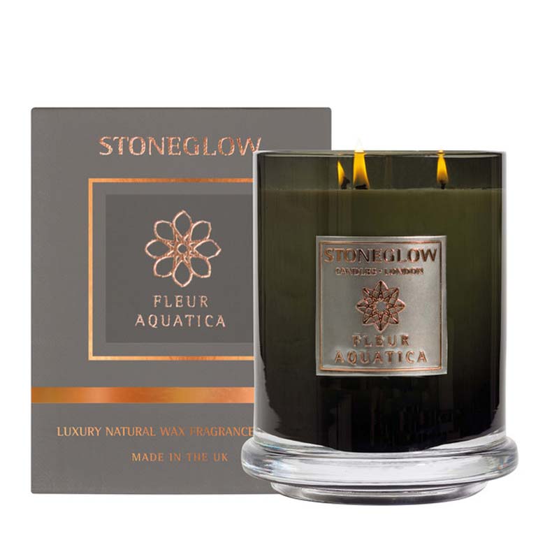 Experience the enchanting aroma of the Stoneglow Metallique Fleur Aquatica 3 Wick Large Candle. This exquisite candle is designed to immerse your space in the delicate and captivating fragrance of Fleur Aquatica.